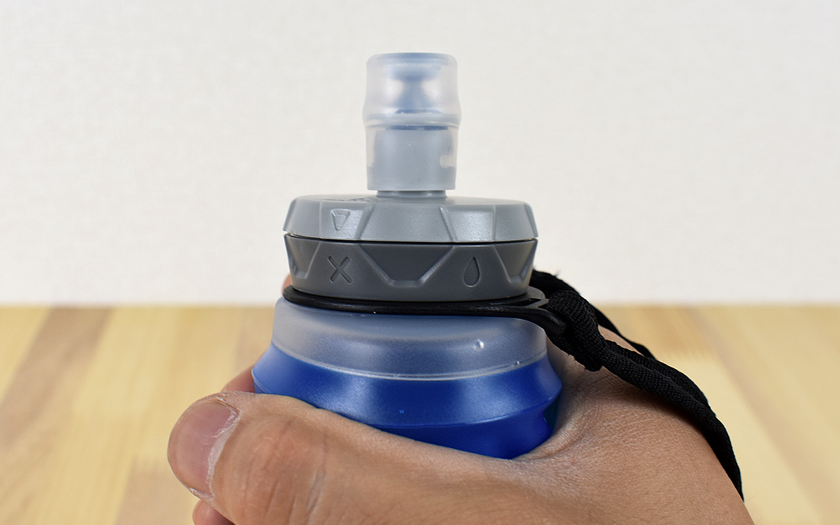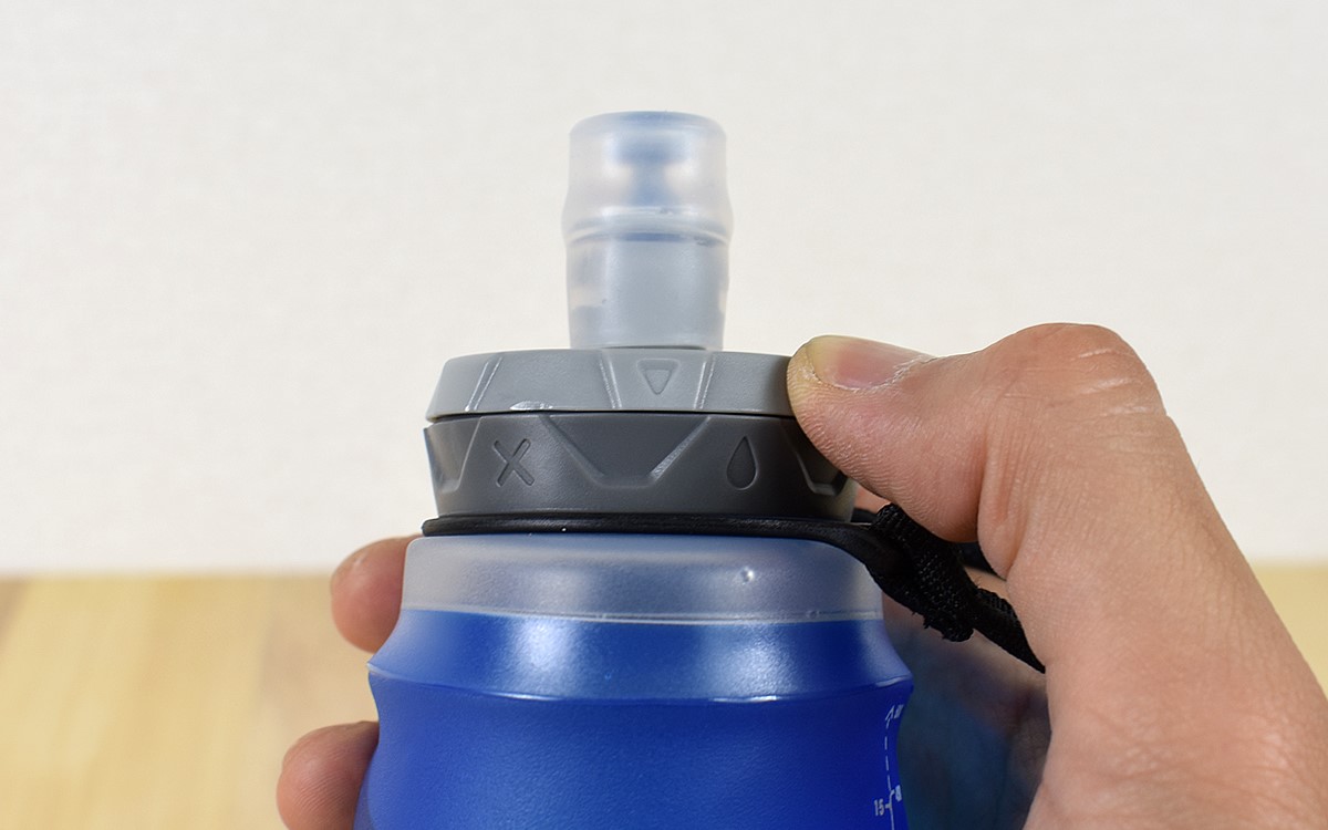 飲み口にはひねるだけでロックが解除されるロッキングシステムが採用されており、▽マークがしずくマークの上にある時はロックが解除されている状態。先端の飲み口を軽く噛みながら吸い込むだけで、わざわざ上を向かなくても給水できます。ちなみにロックを解除したままフラスクを握ってみても、中身が飛び散ることはありませんでした。