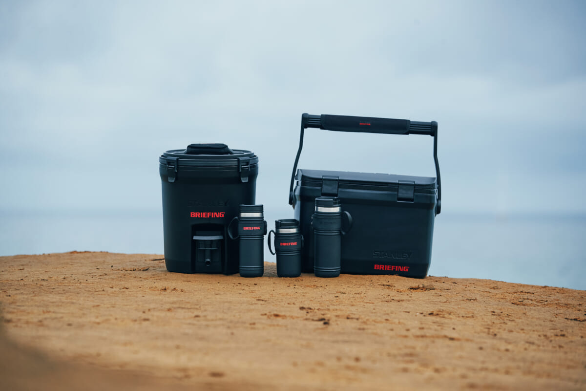 両ブランド初となるコラボレーショアイテムは、ヴィンテージボトルの面影を残し、高い保温・保冷機能を搭載した「LEGACY SERIES(レガシーシリーズ)」で展開中の真空マグ3アイテムやクーラーボックス・ウォータジャグに、ブリーフィングのレッドカラーロゴやオリジナルハンドルパッドを配し特別仕様に。スタンレーを象徴するギアアイテムである、クーラーとジャグは、日本初となるオールブラックデザインに仕上げ、アメリカをルーツとする両ブランドにピッタリな、洗練された無骨感のあるアイテムとなっています。