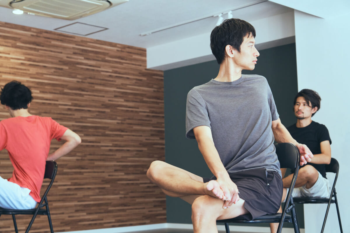 谷戸先生 例えば、腰が凝っているときは、ねじるポーズが効果的です。でも、オフィス内で大胆なポーズは難しいので、椅子に座りながらできるヨガをやってみましょう。