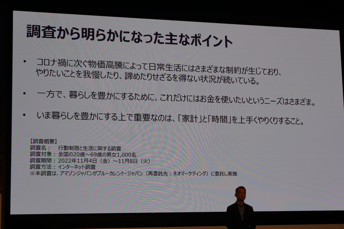 アマゾンジャパン合同会社 プライム・マーケティング事業統括本部の鈴木浩司事業統括本部長によれば、この冬の消費マインドはコロナ禍や物価上昇の影響を受けて節約志向が強いものの、一方で我慢や制約のある生活が続いたことで、「これだけは贅沢したい」「自分や家族にご褒美を」といった、局所的にお金を使って生活を豊かにしたいというニーズも生まれているとのこと。