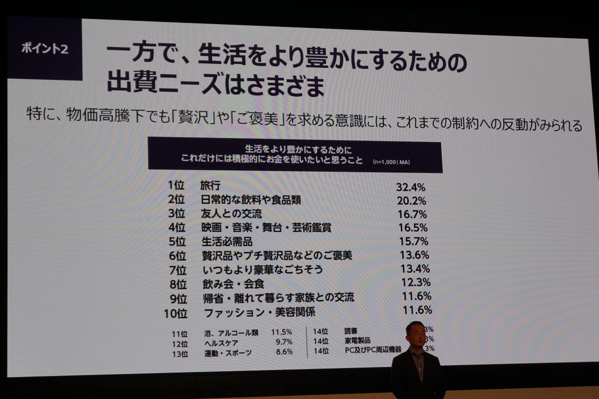 同社の調査によれば、「これだけには積極的にお金を使いたいと思うこと」というアンケートの結果、ダントツで1位になったのは「旅行」で、続いて「日常的な飲料や食品類」「友人との交流」「映画・音楽・舞台・芸術鑑賞」が上位にランクインしているとのこと。