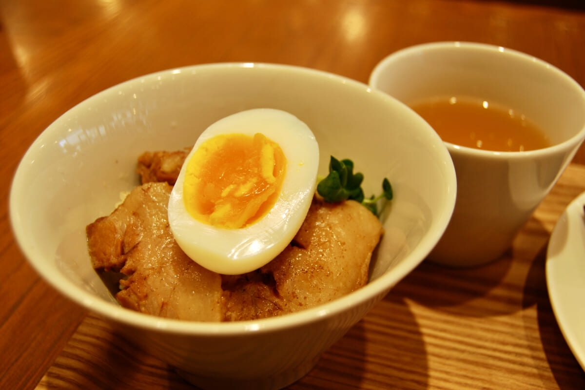 こちらが豚の角煮丼。とろとろの角煮の上には大きなゆで卵。半分ほどいただいたら、天然昆布と老舗店のサバ・カツオ節を使って店内でひかれた一番だしをかけて味変! 無添加の塩昆布や北海道産の山わさびを加えれば、さらに深い味わいに。