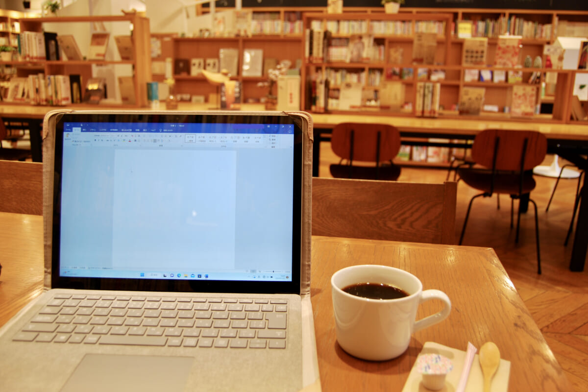 館内にはさまざまなジャンルの本が約2万冊、そしてカウンターから4人掛けの席までが多数用意されています。早速、好きな場所を選んで、原稿書きをスタート。目覚めの一杯ということで、コーヒーを頼んでみました。