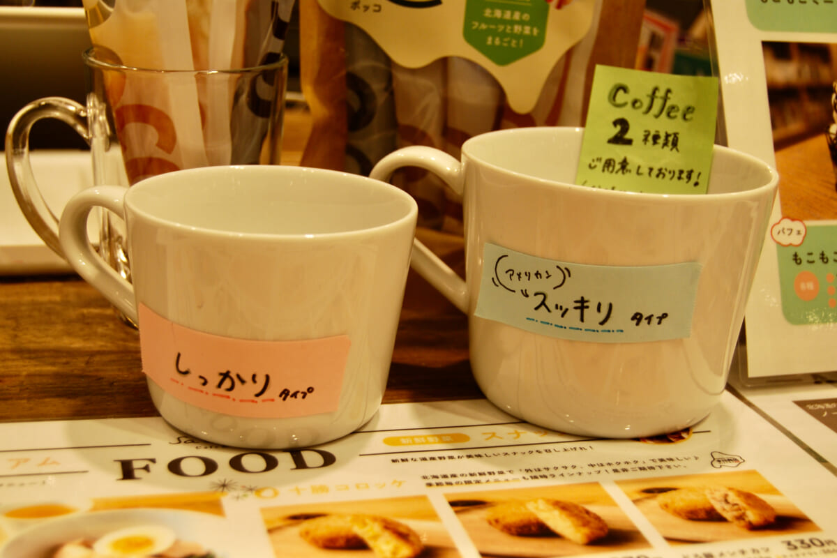 写真左のコーヒー「しっかりタイプ」は、通常のお店の2倍の豆の量を使っているとのこと。コクがあって濃い味わいが楽しめ、冷めても美味しいのが特徴だとか。のんびり本を読みながらコーヒーを楽しみたい人にピッタリですね。なお、ライトな味わいが好みという人には「スッキリタイプ」がおすすめ。