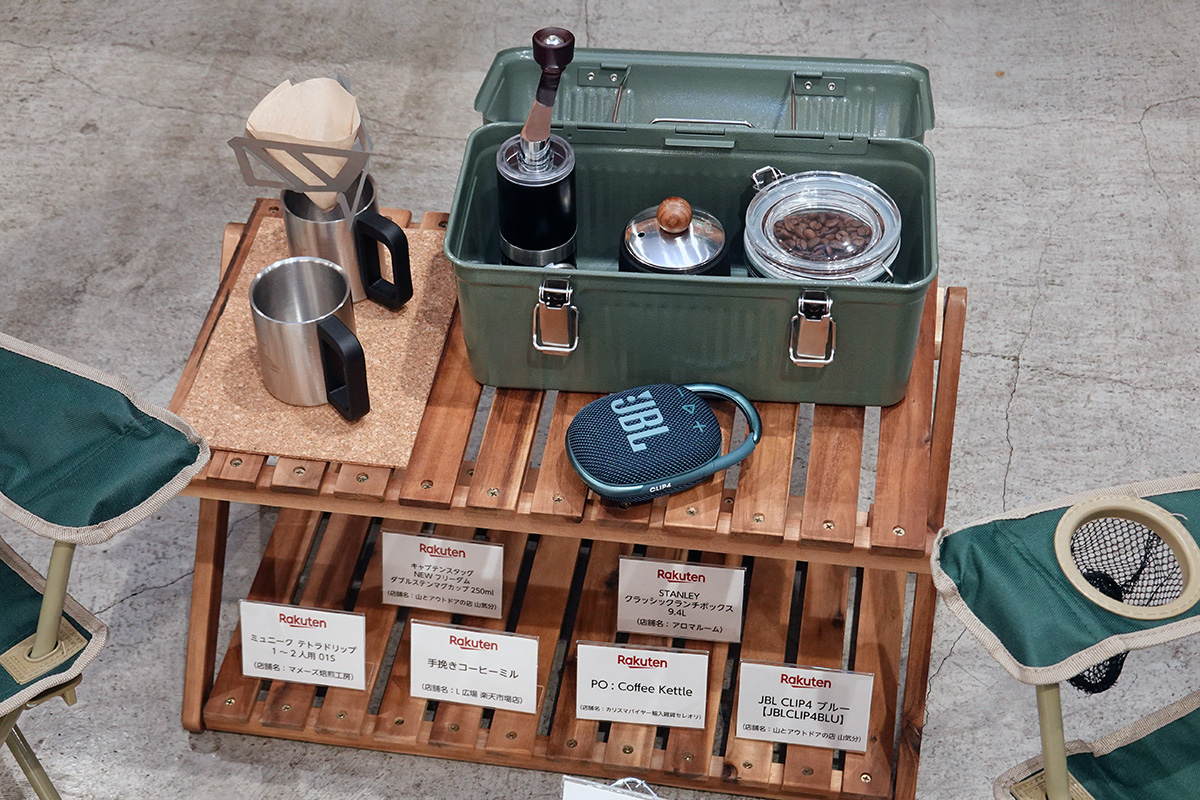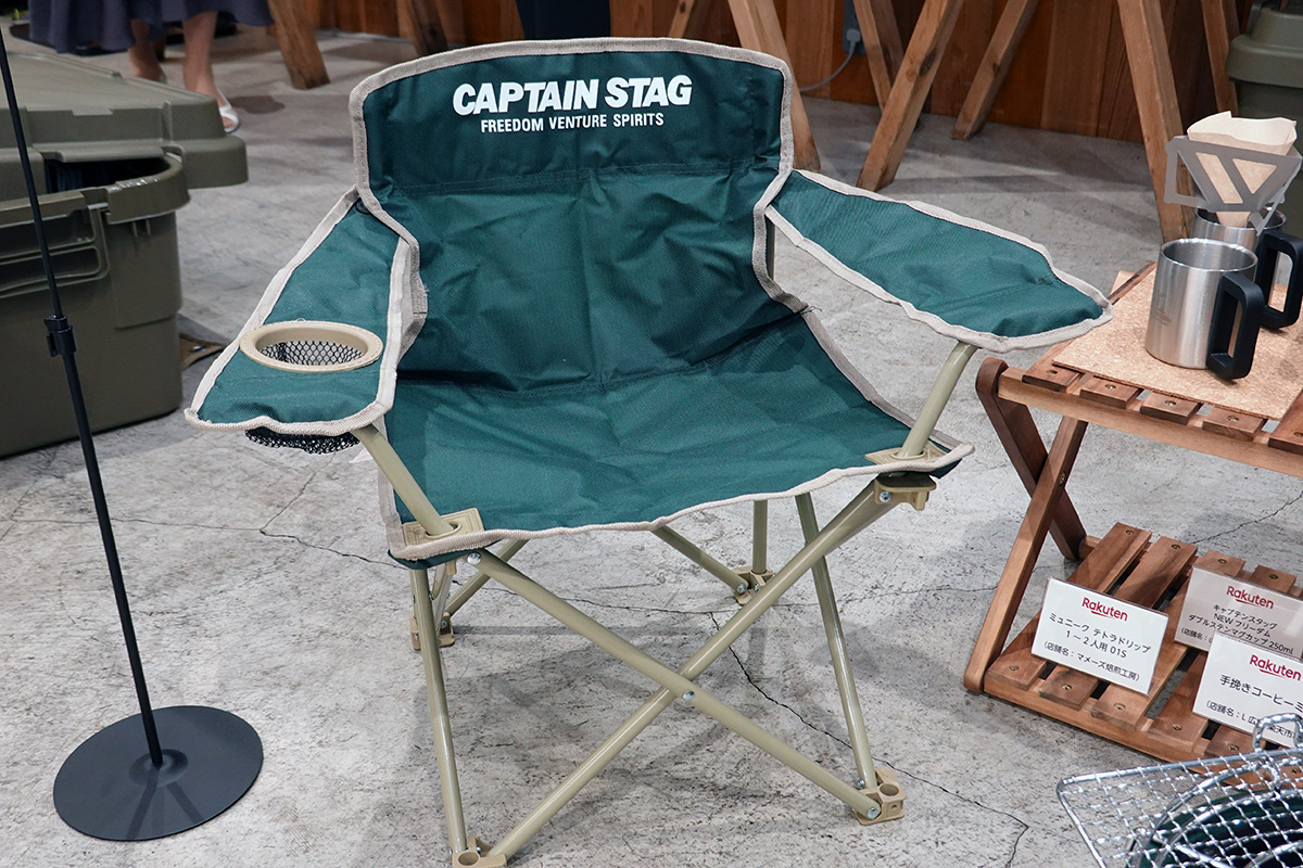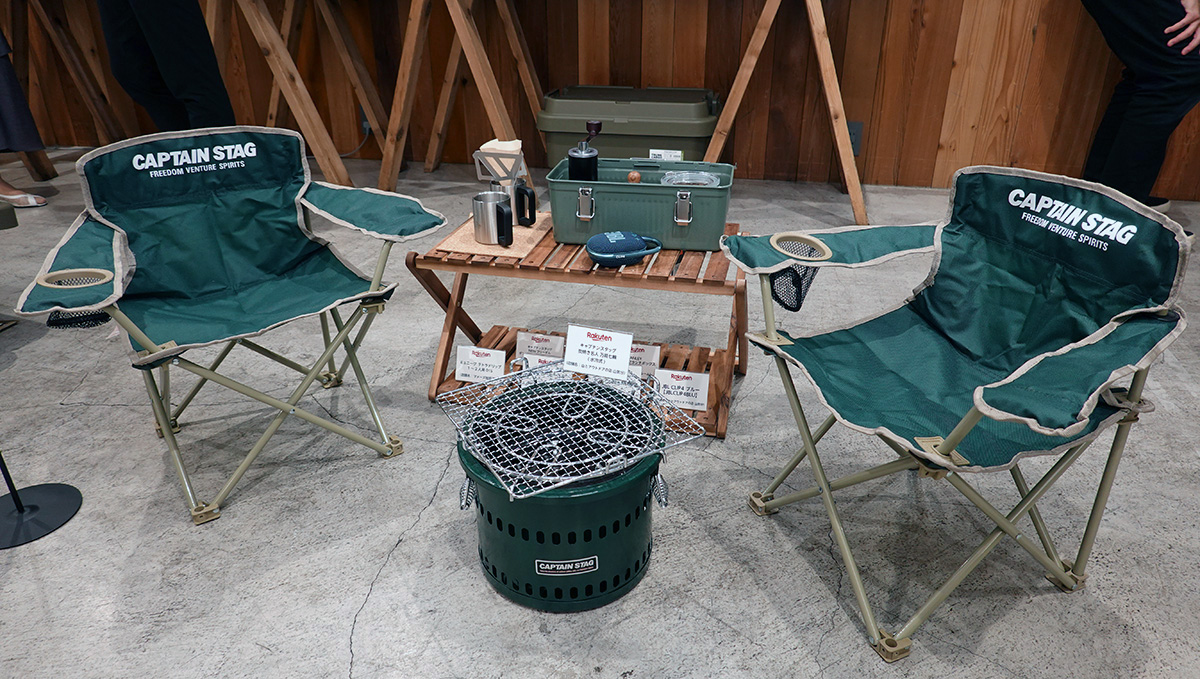 ↑発表に合わせて説明会を開催。トレンドになりそうなアウトドアグッズが並んでいました。写真はチェアリングを想定したアイテムたちです