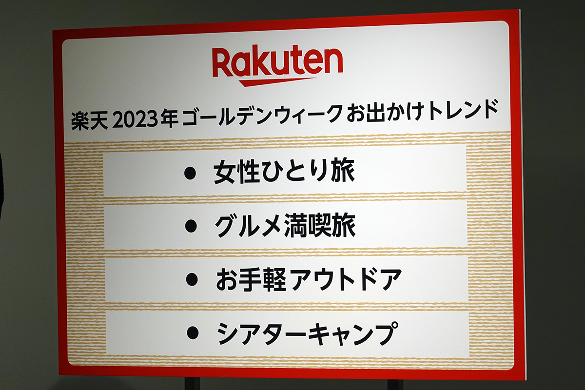 今回発表したトレンドは、楽天市場における約3.9億点の商品の購買動向や、旅行予約サービス「楽天トラベル」におけるGWに向けた旅行などの予約動向に基づいて予測。お出かけでは、「女性ひとり旅」「グルメ満喫旅」「お手軽アウトドア」「シアターキャンプ」がトレンドになるとしています。