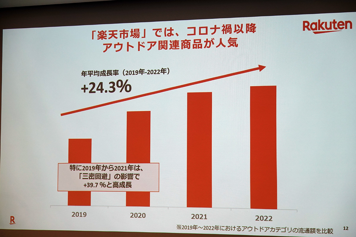 楽天市場では、コロナ禍以降でアウトドア関連商品が人気を集めたそうで、「楽天市場をけん引した成長率」を見せているといいます。今後も傾向は変わらないどころか、アウトドアキャンプの需要も大きく伸びると予想しており、それに伴いアウトドアグッズトレンドも公開しました。