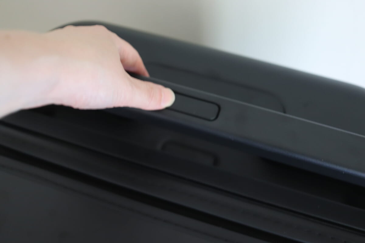ボタンを押し続けるとLARGEサイズまで一気に伸びますが、MEDIUMサイズあたりでスーツケースを軽く横にふると固定されます。LARGEにしたい場合は伸ばしきったあとに地面に置いて軽く押すとしっかり固定されます。