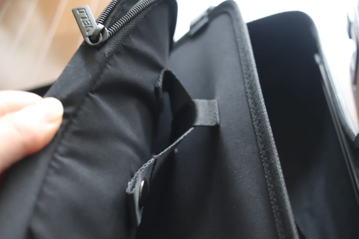 VELO専用PCバッグなら仕切り板にある専用固定ループにストラップで留めることができるので、移動中もスーツケース内に固定可能。バッグには取っ手もついているので、スーツケースから外して持ち運ぶのにも便利です。