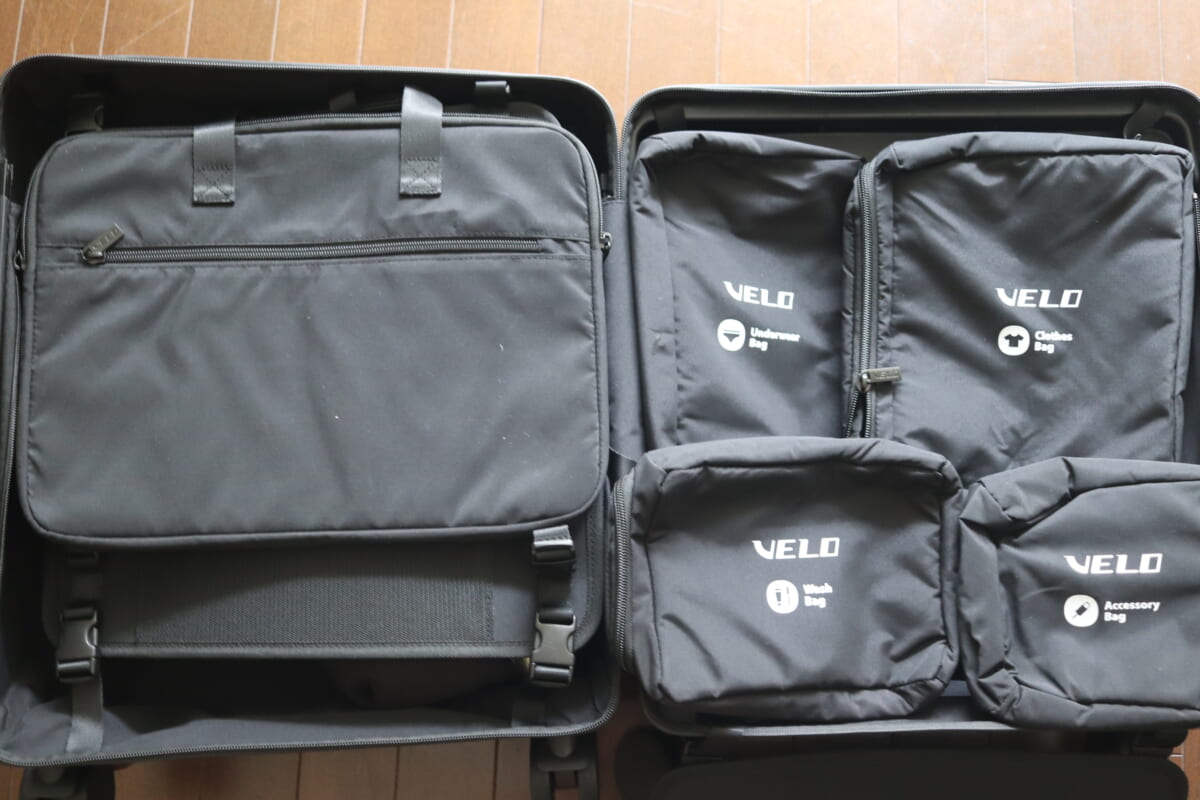 パッキングを楽ちんにするパッキングバッグ4点セットは、VELOのスーツケースの角のカーブに完璧にフィットしているのが特徴。スーツケースをあけたときに見えるすっきり収納は感動ものです。洋服、下着、洗面道具、PCやスマホのケーブルといったアクセサリー入れと4つ展開されています。