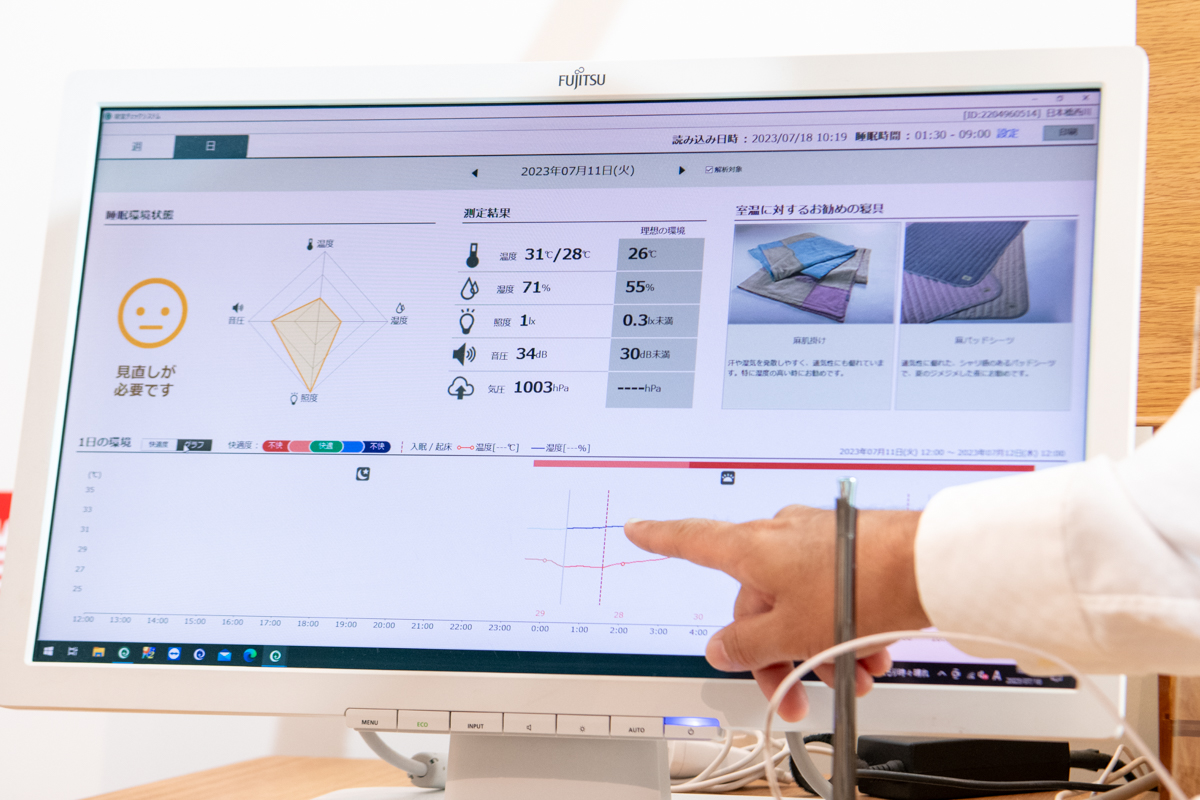 睡眠科学や快眠環境などの専門講習を受けた眠りのプロ「スリープマスター」がユーザーの眠りを計測し、可視化。一人ひとりにフィットした上質な睡眠環境を提案してくれます。ネットで予約したうえで、店頭でヒアリングし、1〜2週間、専用機器で計測。その後、再度来店し、取得したデータを元にスリープマスターがアドバイス&サポートツールを紹介します。