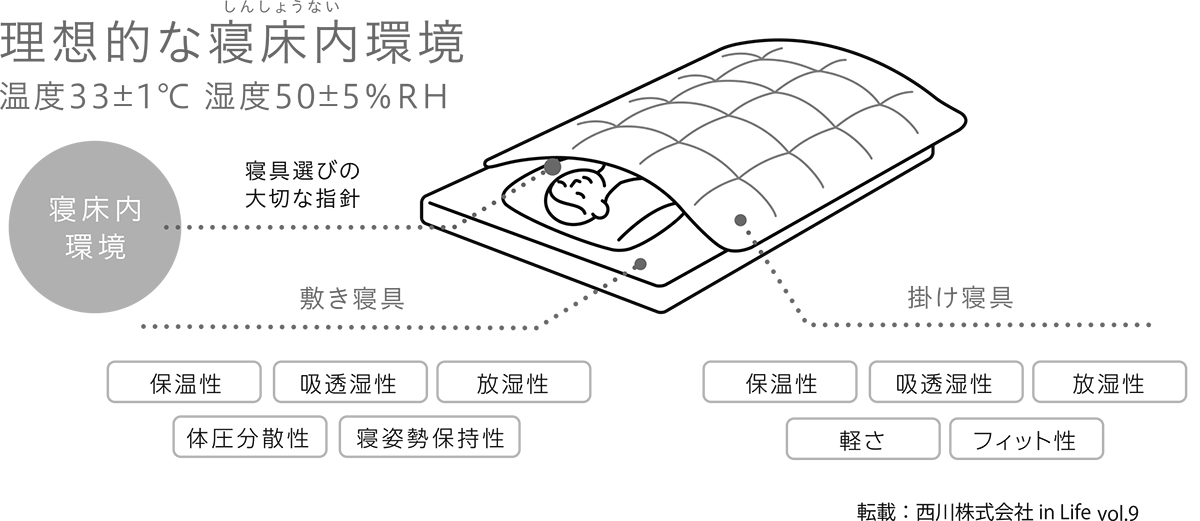 「夏場でもふとんをかけて寝るようにしましょう。その際、寝室の温度は25〜6度、湿度は55%程度が最適な空間です。さらに、敷ふとんと掛けふとんの間の温度は33度±1度、湿度が50%±5%にするのがベストな寝床内環境とされています。