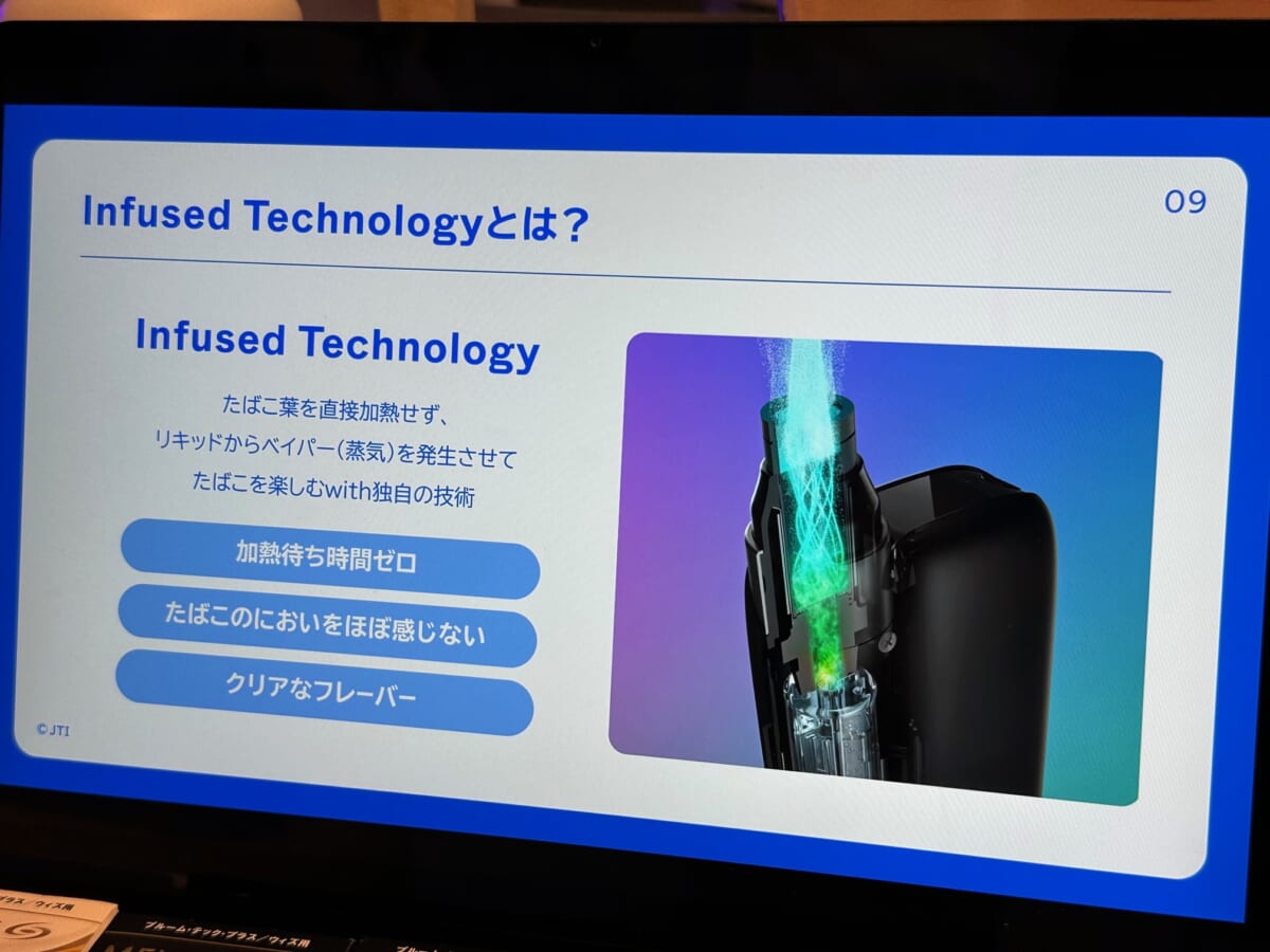 ウィズ2は低温で、液体リキッドを加熱し、出てきた蒸気をたばこ顆粒の入ったカプセルに通すことで味が楽しめます。JTは、それを“インフューズドテクノロージー”と名付けました。たばこ葉を直接加熱しないため、たばこのにおいをほぼ感じず、燃焼に伴う副流煙が発生せず、さらに加熱によって発生する雑味が少なくなり、よりフレーバー感の際立った味を楽しむことができます。