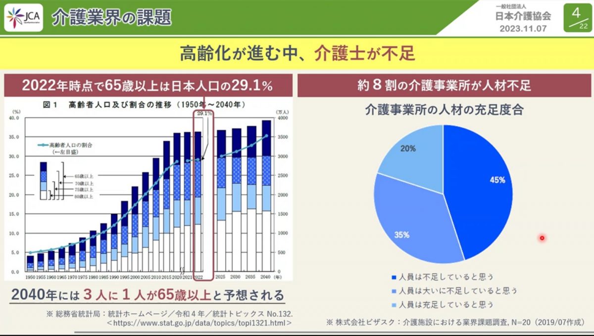 総務省統計局によると、高齢者の人口の割合は年々増加しており、2022年時点で65歳以上は日本人口の29.1%。2024年には3人に1人が65歳以上と予想されている。一方、約8割の介護事業所で人材不足の悩みを抱えているという。日本介護協会 理事長 平栗潤一氏は「排泄臭や加齢臭、生活臭など、ニオイのために対応しきれないと感じる若手の職員が多くいます」と、この人材不足の一因に「ニオイ問題」があることを明かした。