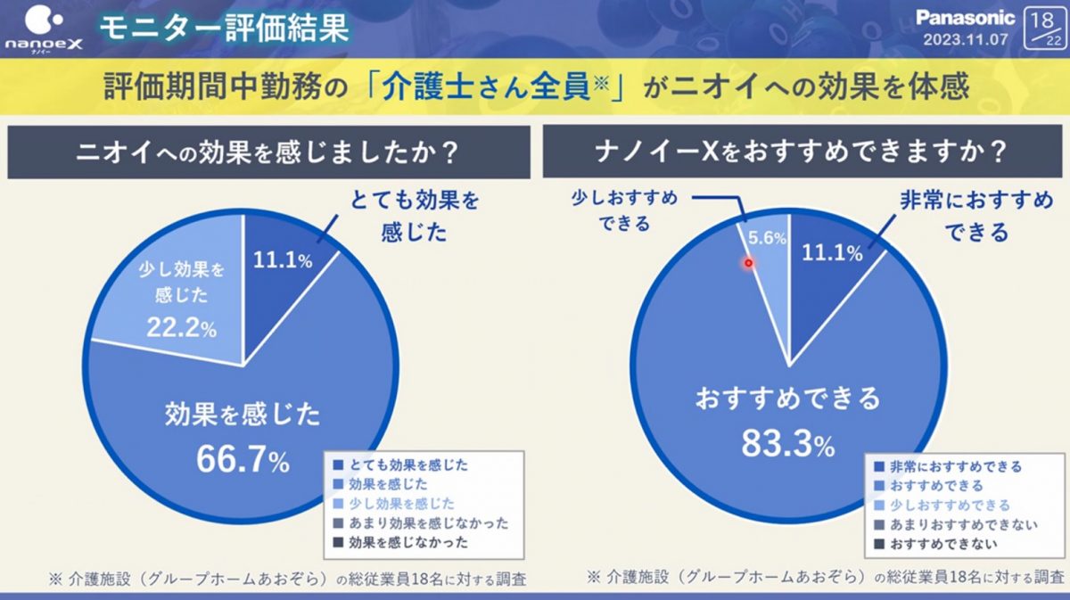 パナソニックは11月7日、ナノイーXの照射による介護環境のニオイと尿素の脱臭実験を実施し、その効果を確認したことを発表した。また、一般社団法人日本介護協会(以下、日本介護協会)の協力のもと、介護施設にナノイーX搭載のエアコンと大型空調機を導入しモニター評価をした結果、介護士がニオイの効果を体感したことも明らかにした。
