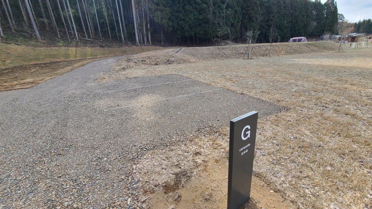 フリーサイトの中でもっとも奥に位置するのが、サイトG。それほど広くないので、駐車スペースからすぐに荷物を運び込むことができます。サイトの背面が深い森になっているため、そちら向きにチェアやテントを設営すれば、深い森の中でキャンプしているような気分に浸れます。