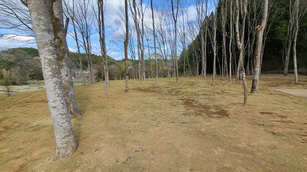 木立の中でキャンプできるサイトF。より自然と触れ合える環境であるほか、木立のおかげでお互いの視線が気になりにくいというメリットもあります。