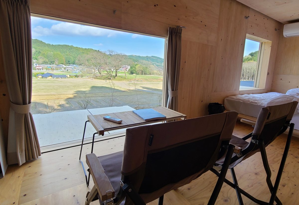 住箱サイトは高い位置にあるので、キャンプフィールド全体や遠くの山々を見渡せるいちにあります。広い窓や、張り出した縁台のおかげで、室内からでも豊かな自然を感じることができるのです。