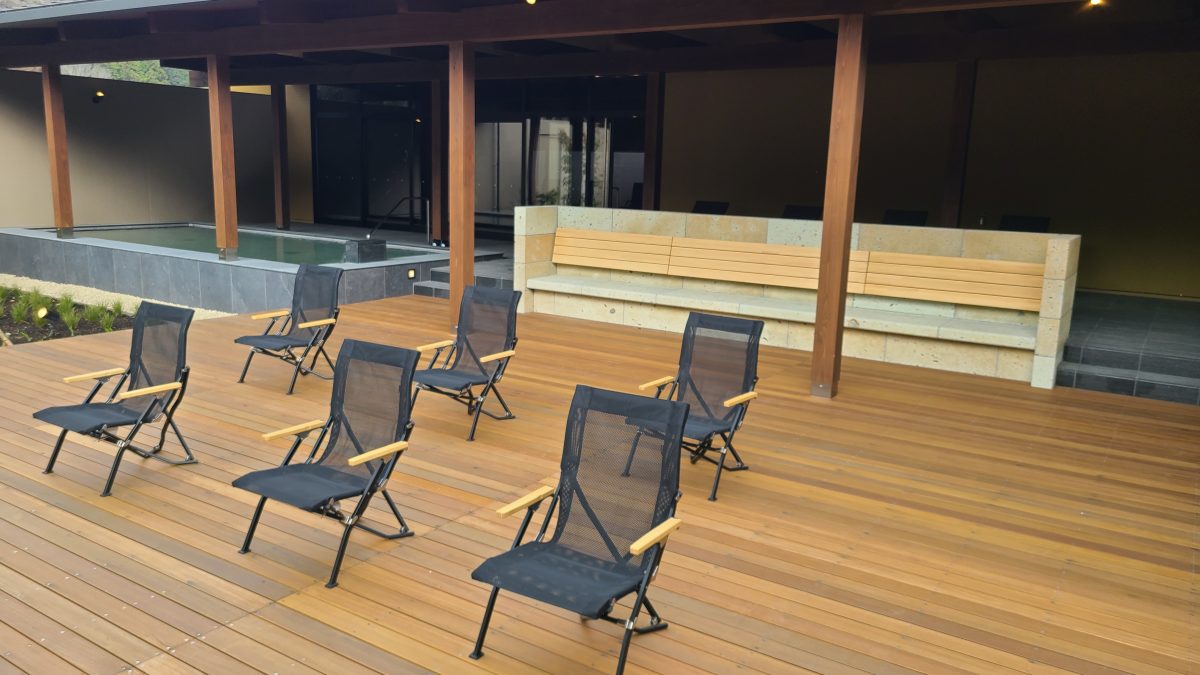 外気浴スペースでは、目の前に鹿沼市の7割を占めるという森林が広がり、遠くには山々を望むことができます。奥にある石のベンチは、鹿沼特産の「深岩石」を利用したもの。
