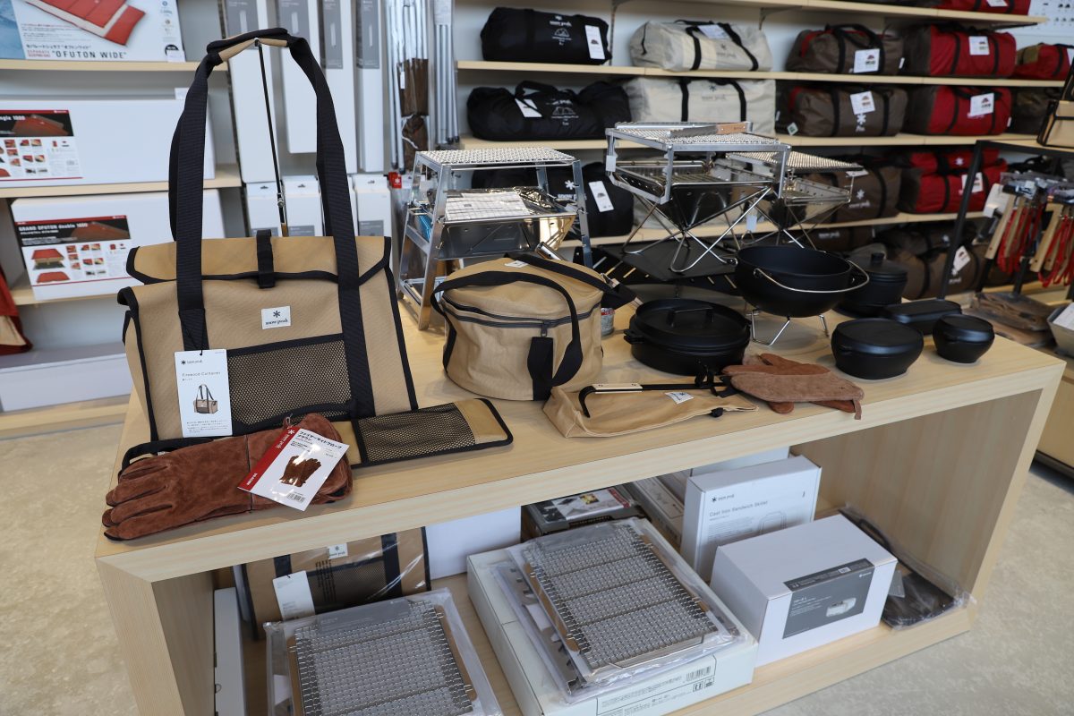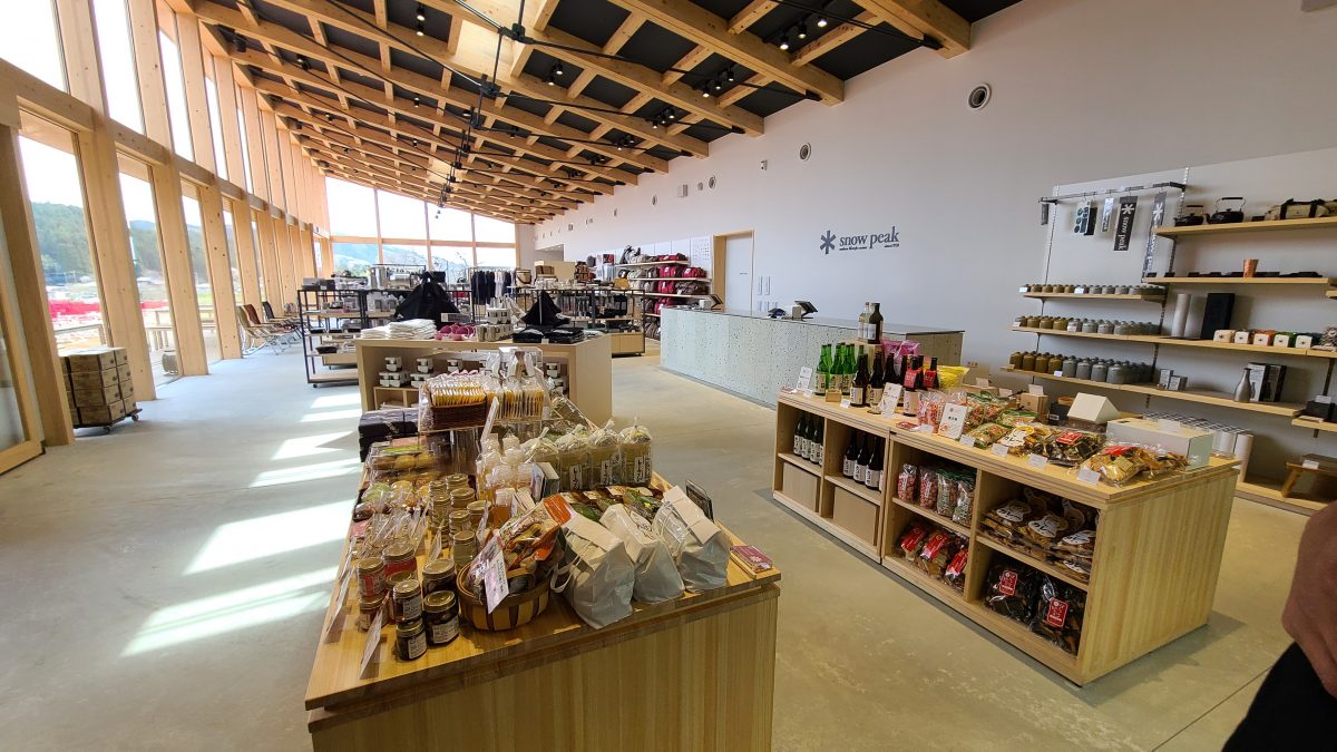 管理棟にあるのが、スノーピークの直営ストア。キャンプ場の受付によくある小さな売店とはまったく異なる、しっかりとした規模のアウトドアショップになっています。