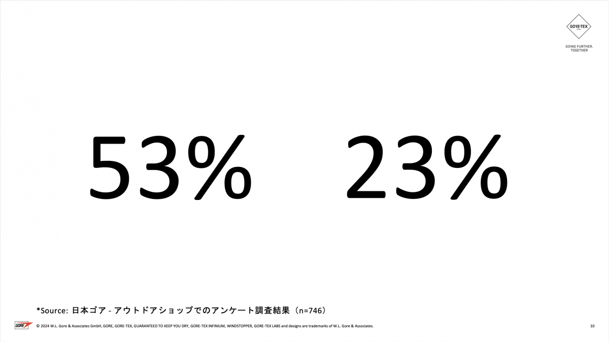 「このアンケートはアウトドアをされている方に伺っていますので、アウトドアをされていない方だと当然もっと高い数字になるかと思います。15%の『洗ってはいけない』という方は、何としてでも洗っていただきたい。さらに、汚れていないと思っている方、こういう方はかなり多くいると思いますので、これからケアをすることは大変ではないということ、簡単に撥水回復できることをしっかり伝えていきたい」(日本ゴア/阿部氏)
