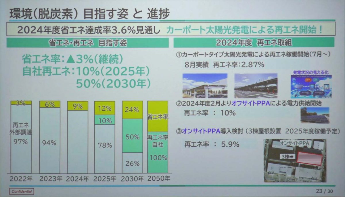 また、工場としては社会貢献の意味から、脱炭素化への取り組みを積極的に進めることが欠かせません。松本工場では毎年3%ずつ省エネ率を高める活動を行うと共に、2050年までに再生エネルギー率100%も目指すとのこと。すでにカーポートの屋根に太陽光パネルを組み込む活動を2024年7月から開始し、さらには2024年2月からはオフサイトPPA(Power Purchase Agreement)による電力供給をスタート。2025年度にはオンサイトPPA導入計画も進行中とのことでした。