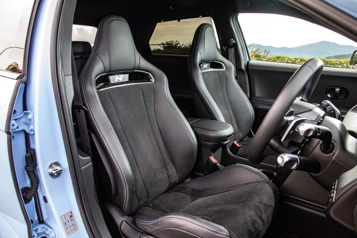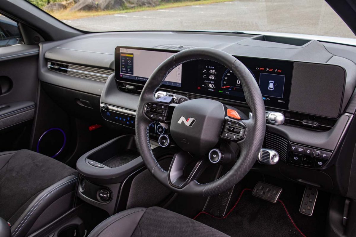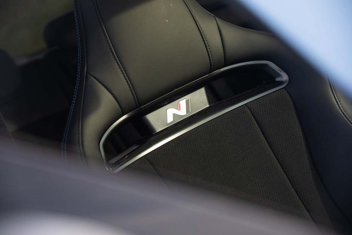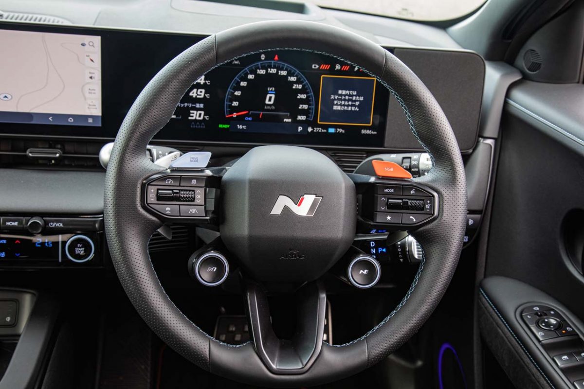 運転席に座ると、ダッシュボードにはN専用グラフィック付き12.3インチカラーLCDメーターをはじめ、ヒーテッド機能付き本革ステアリングホイール、メタルペダルなどインテリアにもN専用品が数多く採用されていることがわかります。シートもヘッドレスト一体型のアルカンターラ+本革仕様のN専用タイプで、サポート性が高く手触り感も上々。また、ステアリングホイールやドアトリム、アームレストなどはパフォーマンスブルーアクセントが施されるほか、Nエンブレムウェルカムライトも搭載されていました。