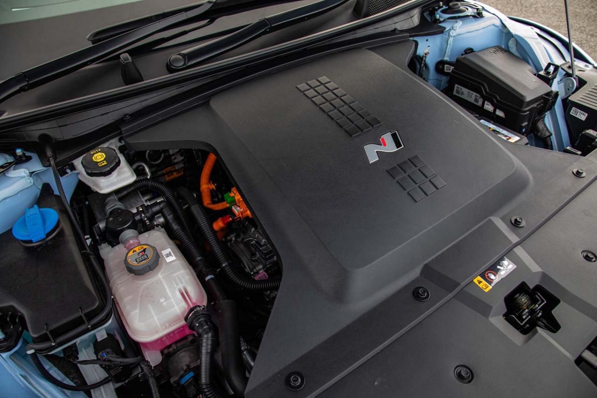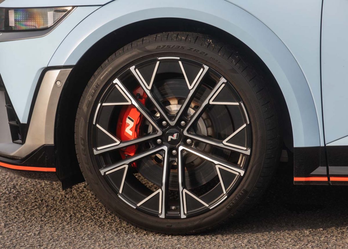 エクステリアにも「N」ならではオリジナルな仕様が施されました。空力性能を向上するためにエアカーテンとアクティブエアフラップ付きの専用バンパーを採用し、スポークからのぞく赤色のブレーキキャリパーやボディ下部のオレンジ色のストライプからは、否応なく高性能ぶりが感じられます。なお、ボディ寸法はベース車と基本的に同じですが、専用エアロパーツによって少しだけ長くなっています。