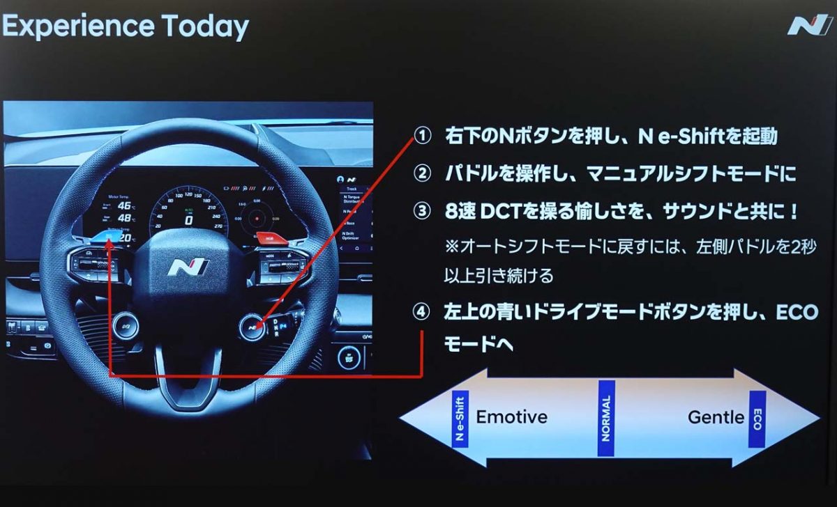 ここからはいよいよアイオニック5 Nの走りを体験となりますが、それをより楽しむためにはステアリングホイールに用意された4つのボタンを使いこなすことがポイントとなります。なにせ、これを使いこなせばBEVを活かした多彩なドライブモードとオーバーブースト機能を設定でき、これらは任意にプリセットも可能となるのです。