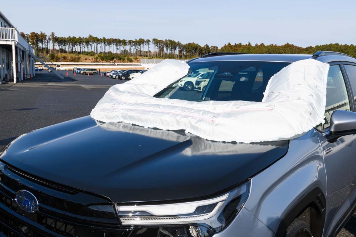 歩行者保護エアバッグは、自車が歩行者と前面衝突した際に、ボンネットとフロントウインドウの隙間から展開してフロントのAピラーなどの硬い部分を覆って歩行者のダメージを軽減するというもの。新型フォレスターでは、サイクリストに衝突した際により高い位置に頭部がぶつかる可能性が高くなるとして、エアバッグの容量を増やして展開エリアを拡大。歩行者だけでなくサイクリストにまで万一の安全性を高めたのです。スバルによれば、これは「おそらく世界初の装備」ということでした。