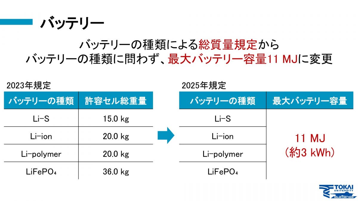 そしてレース勝敗の鍵を握るのが「エネルギーマネジメント」です。車体サイズの大型化により、ソーラーパネルの搭載可能面積こそ増えましたが、一方でバッテリー容量が実質半減しているのは大きなハンデとなります。