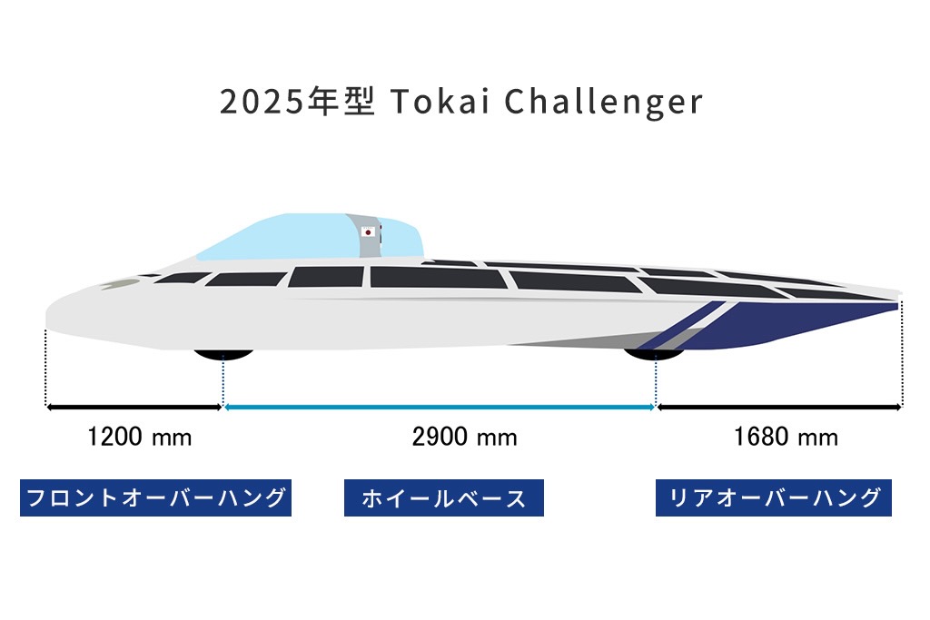 「2025年型 Tokai Challenger」ではこれに対応するため、ホイールベースの長さを2900mmに延長し、その結果、フロントのオーバーハングは1200mm、リアのオーバーハングは1680mmに変更。
