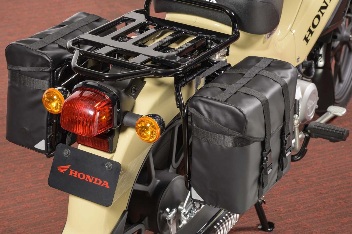 ベース車との違いを識別するのにもっともわかりやすいのが、フロントフェンダー先端の白いステッカー、リアフェンダーにある白い三角ステッカーで、これはいわば原付二種であることを示すものであって、当然ながら新基準原付にこのステッカーは貼られていません。また、新基準原付は二人乗りができませんから、リアのタンデムステップを装備していないのも大きな違いです(スーパーカブ110プロは元々1名乗車であるためタンデムステップは非装備)。