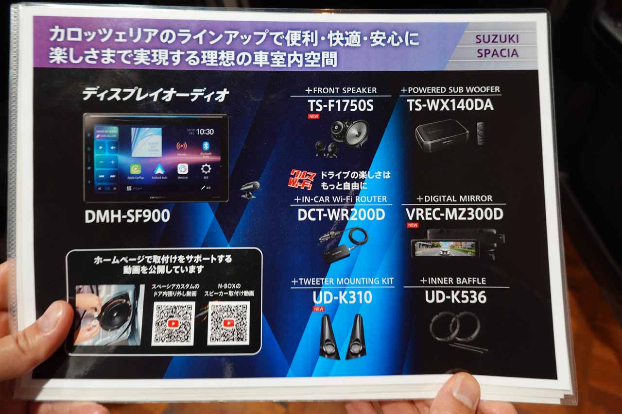 クルマに組み込まれていたのは17cmセパレート2ウェイスピーカー「TS-F1750S」で、これをスペーシア専用設計であるツィーター取付キット「UD-K310」とインナーバッフル「UD-K536」を用いて装着していました。そこにヘッドユニットとして10.1インチ大画面を持つディスプレイオーディオ「DMH-SF900」を据え、さらにアンプ内蔵サブウーファー「TS-WX140DA」をカーゴスペースに設置。価格的にも比較的手頃な構成です。