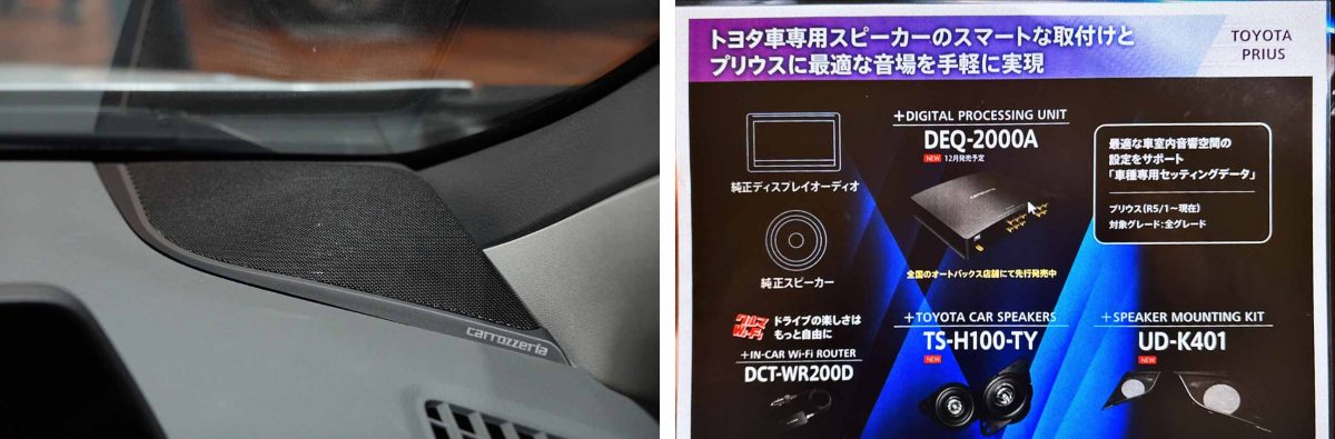 TS-H100-TYにはツィーター部のグリルに回転式ディフューザーが備えられ、車種ごとに最適な音場を提供可能にしています。さらにフロントガラスの傾斜がきつい現行プリウス用として、より最適な角度で取り付けられる専用スピーカー取付キット「UD-K401」も用意。また、試聴したシステムには今年5月に発表され、12月に発売が予定されるデジタルプロセッサー「DEQ-2000A」も組み合わされていました。