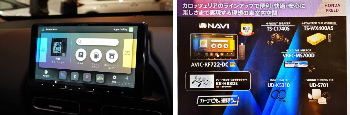 ポイントは、現行型フリード専用に準備された取付キット「KK-H88DE」を使ってシステムがインストールされていることです。フリード側はオーディオレス仕様として2DINサイズのスペースさえあればよく、このキットを使うことで後付け感を感じさせないセットアップが可能となります。