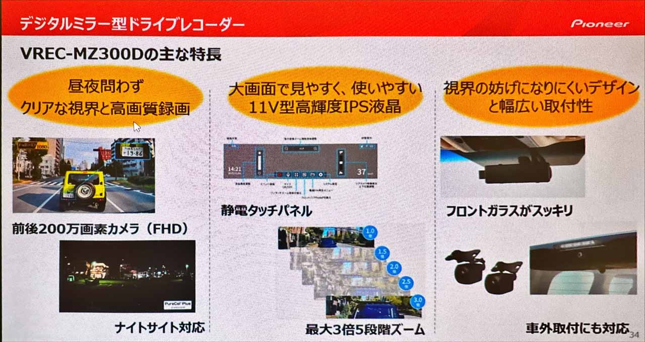 最後に紹介するのは、ミラー型ドライブレコーダー「VREC-MZ300D」です。このモデルは、上級機「VREC-MS700D」で好評だった機能を継続搭載しながらも、より廉価な価格を実現したスタンダード機となります。