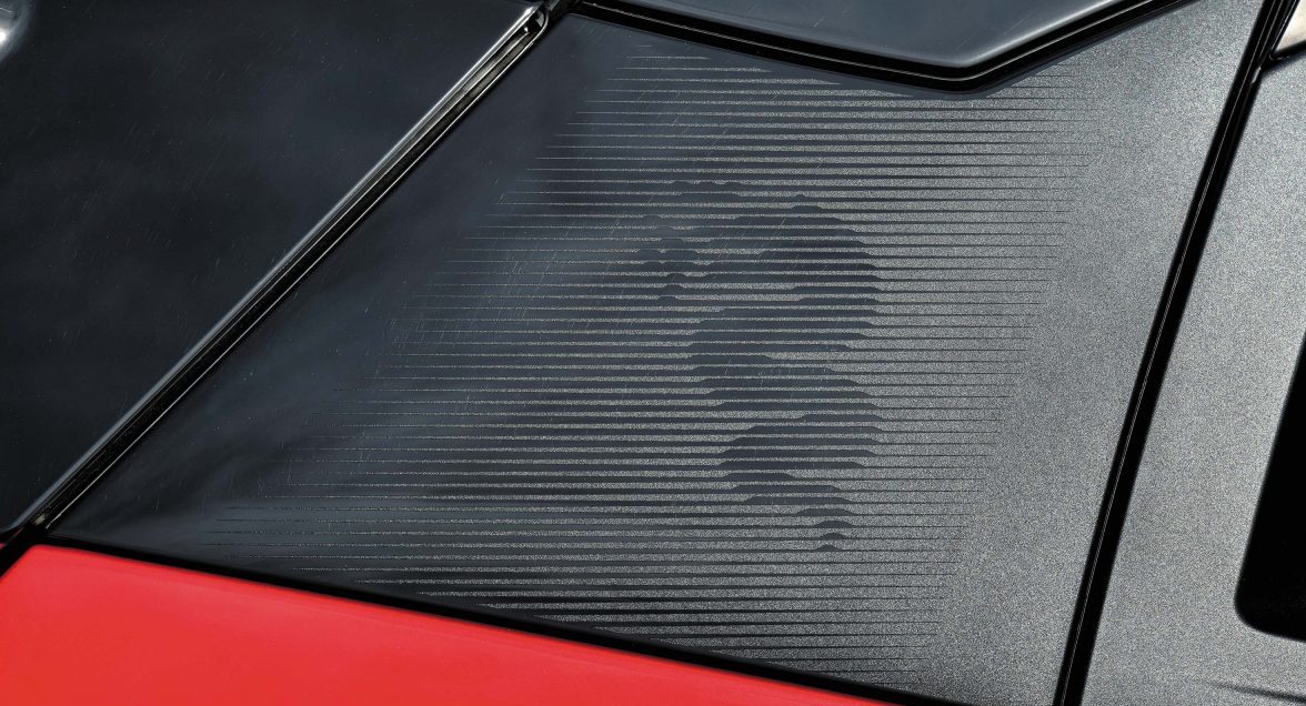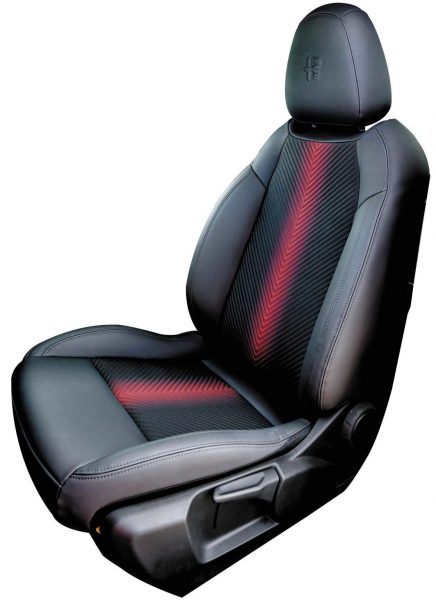 取材車のグレードにはブラックの地色に赤いラインがグラデーションで浮かび上がるシートが採用されています。素材はファブリックとテクノレザー(合皮)で、このモダンでサイバーなラインはリアシートにも付けられています。