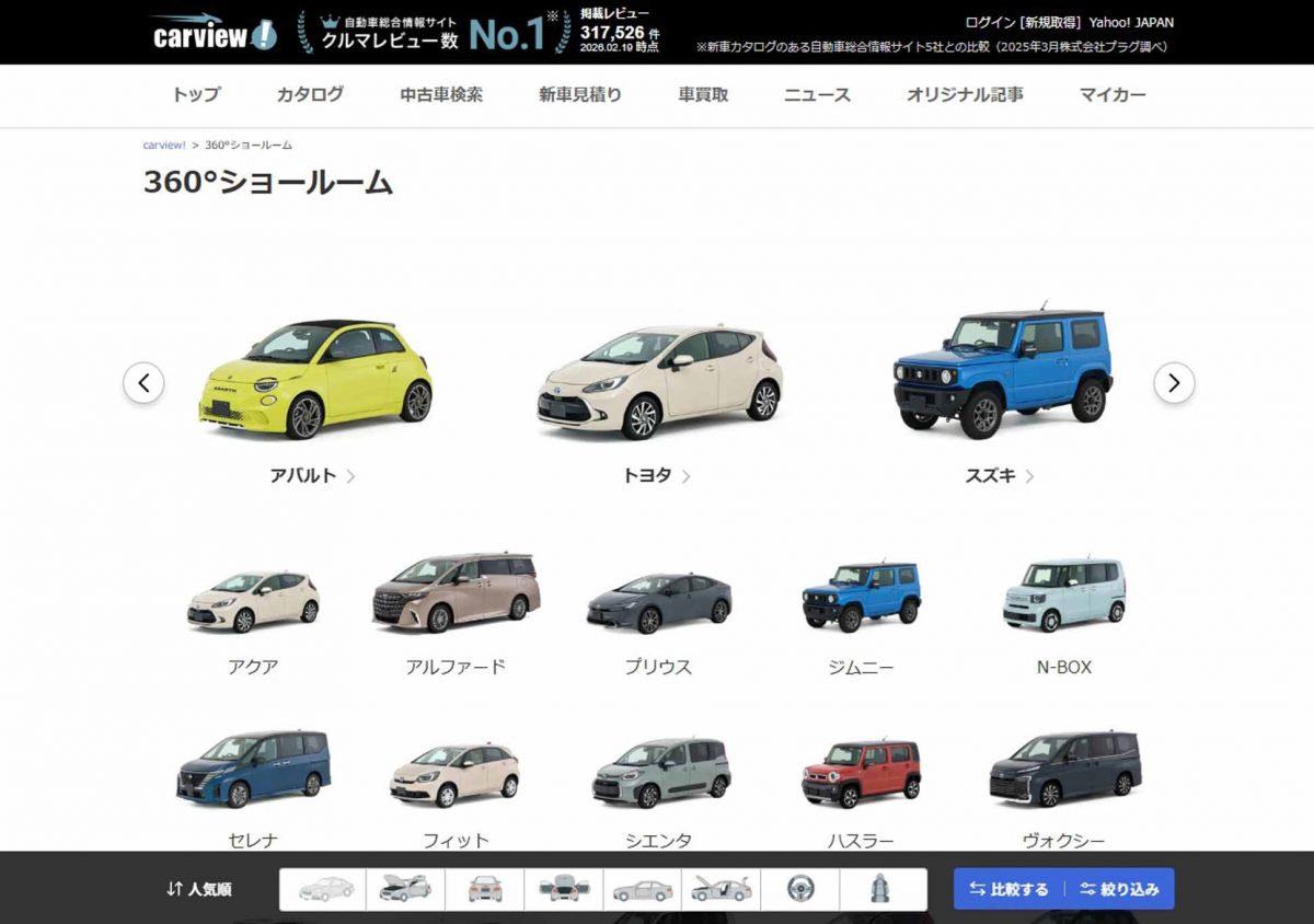 LINEヤフーが運営する自動車総合情報サイト「carview!(カービュー)」が、「360°ショールーム」の本格提供を開始しました。これは、車両を並べて内装・外装を360度回転させて自由に閲覧できるサービス。この本格提供を機に、本サービスは対応車種を250台まで拡大し、スマートフォンはもちろんのこと、PC上でも使えるようになっています。新たなクルマ選びにつながるサービスとして注目でしょう。