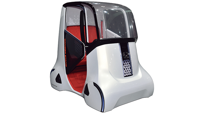 大人2名が並んで乗車するコンパクトボディの自動運転車。全方位に駆動する車輪を持ち、狭い路地にもスイスイと入っていけます。