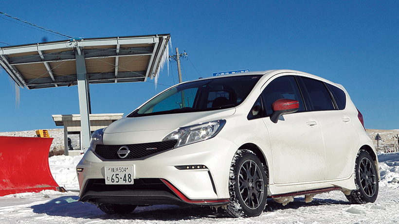 ノートの高性能版・ノート ニスモはFF。前輪が圧雪路の雪を掻いてアグレッシブに前に進む。試乗車のなかでも、平均車速はいちばん速かった。