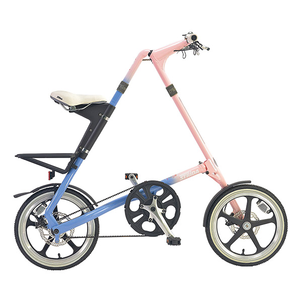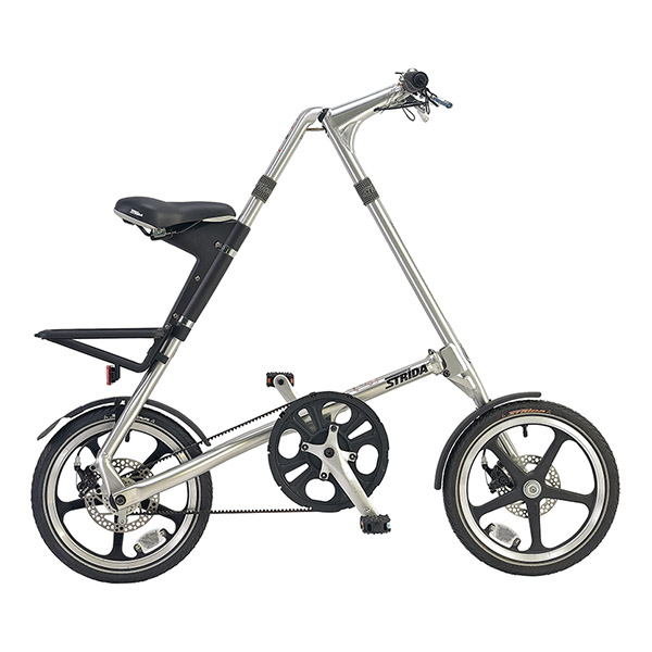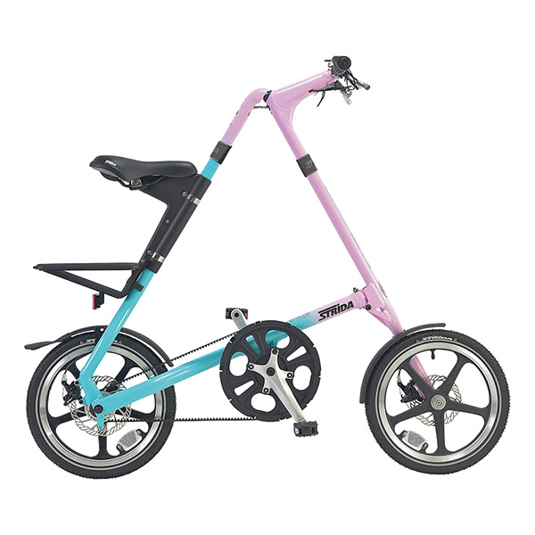 基本的に折りたたみ自転車というと、フレームの半分に畳むタイプが多いですが、こちらのストライダは車輪とフレームが重なる形で折りたたみます。そのため、畳んだあとにも、押しながら車体を移動させることが可能。マンション内の廊下の移動や、エレベーターへの積載、駐車場まで押して移動できるのは、2つ折りタイプの折りたたみ自転車にはないメリットですね。