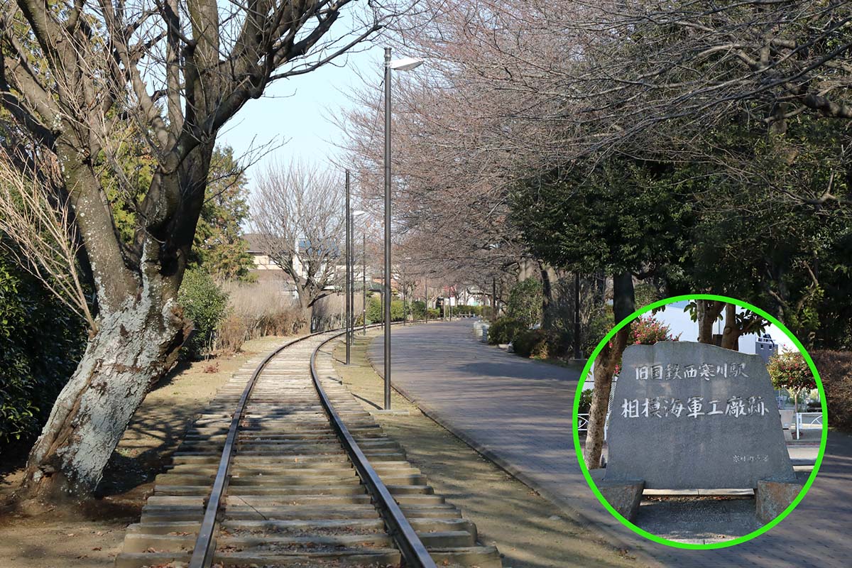 寒川駅から旧西寒川駅まで設けられていた支線は、きれいな遊歩道として整備されている。一部に線路も残されている。西寒川駅までは1.8kmほどで25分あれば歩くことができる。旧西寒川駅前からはバス停もあるので、帰りはバスを利用しても良いだろう。