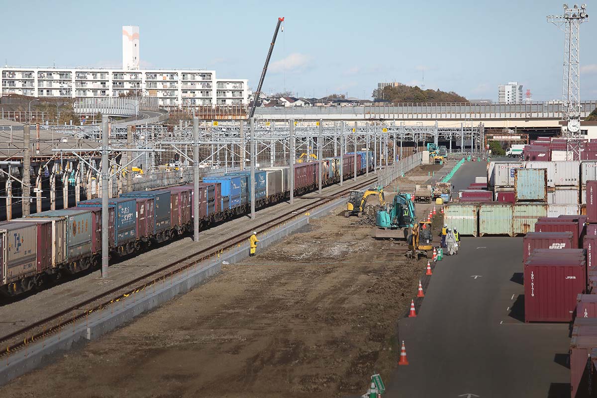 羽沢横浜国大駅のホームを過ぎるとレールが分岐するポイントがある。まっすぐに進むのが2022年度に開業予定の「相鉄・東急直通線」だ。その左右に分かれるレールが、JR東海道貨物線を結ぶレールで合流ポイントまで敷設される。