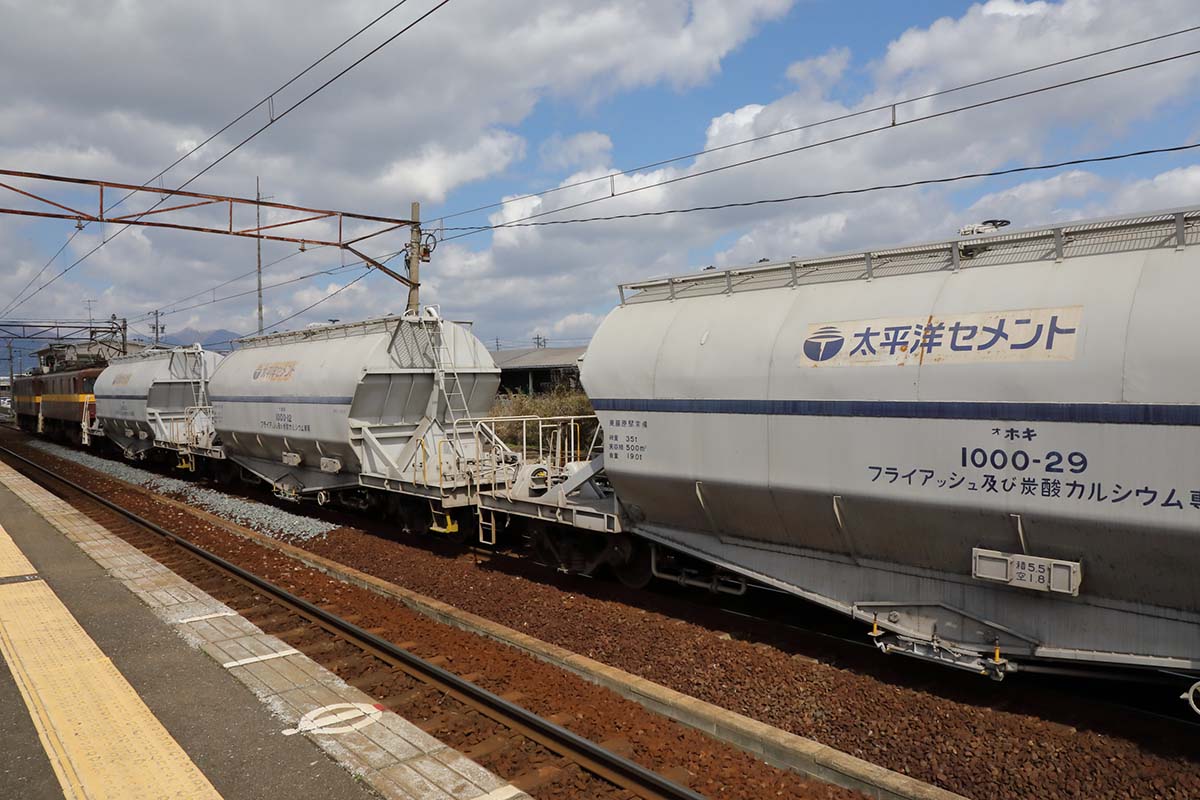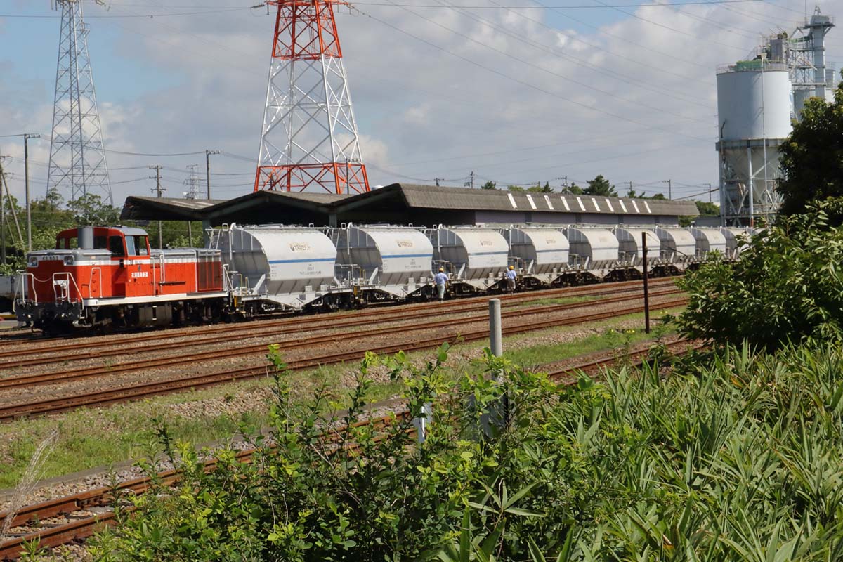タンク車の中身はセメント。藤原工場で造られたセメントの粉体をタンクに載せて運んでいる。実は粉体で運ばれるセメント輸送はここだけ。