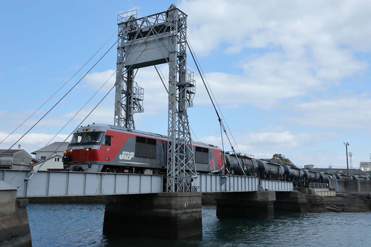 四日市港には日本で唯一、鉄道用の可動橋として残る末広橋梁を渡る。1931(昭和6)年に造られた橋で、「近代化産業遺産群」にも指定された貴重な橋だ。