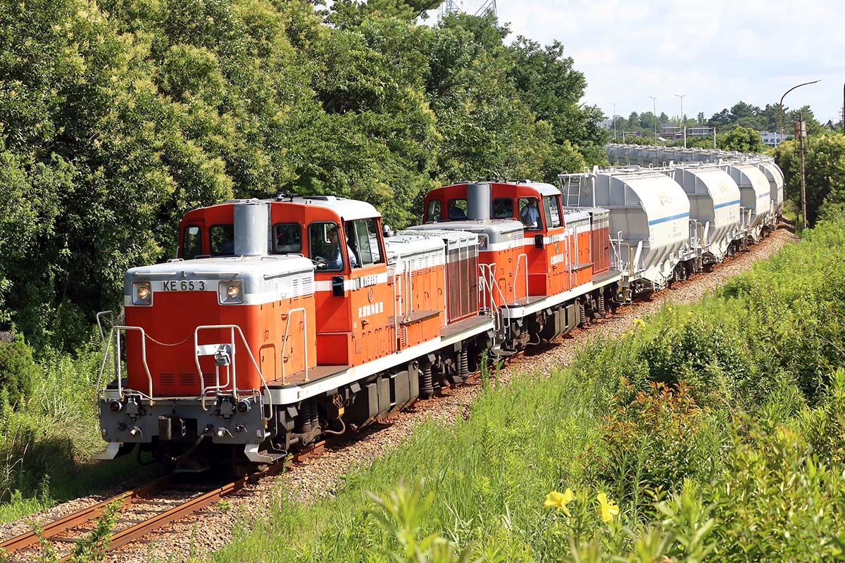 こちらの貨物列車では碧南市へ向かう列車が炭酸カルシウム(炭カル)。そして、帰りにはフライアッシュ(石炭灰)を載せて走る。同列車は大府駅の先はJR関西本線、JR東海道本線を通って三岐鉄道の東藤原駅へ運ばれる。