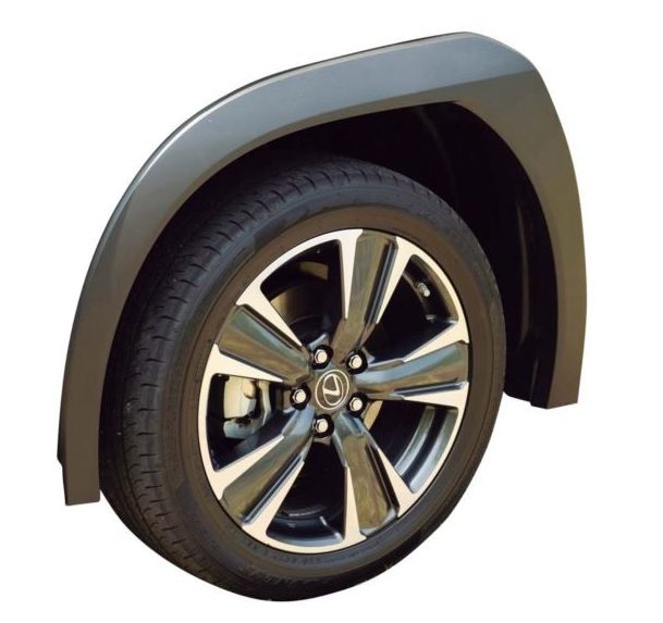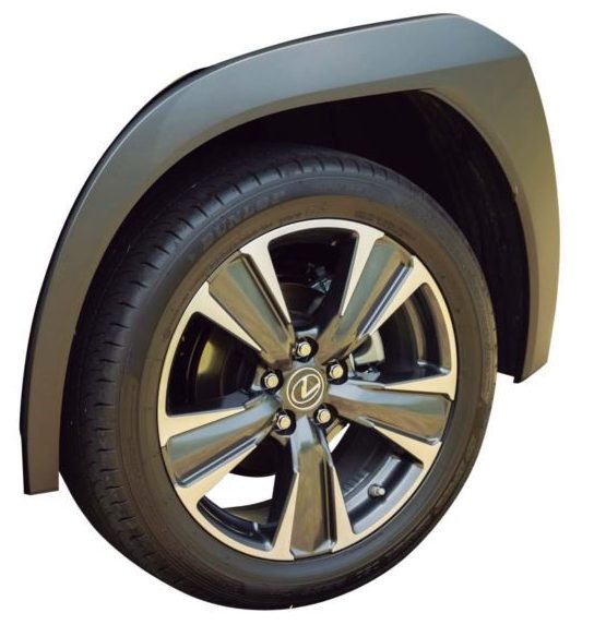 レクサスの他のSUVと比べると、樹脂製のオーバーフェンダーがブ厚くなっていて、SUVらしさを強調しています。また樹脂部分の外側も張り出していて、そのうえ後方へ向かうラインを描いており、アグレッシブさが強調されています。