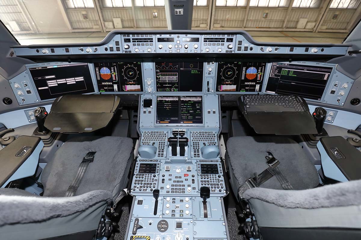 心配はご無用。A350では操縦はコクピット内の席の左前にあるサイドスティックが操縦桿となっている(副操縦士の場合は右前)。通常の飛行機とは異なるのだ。この構造の場合、座席の前にはノートや、パソコンなどを置ける構造となっている。操舵輪がないだけ、足下も快適かも知れない。