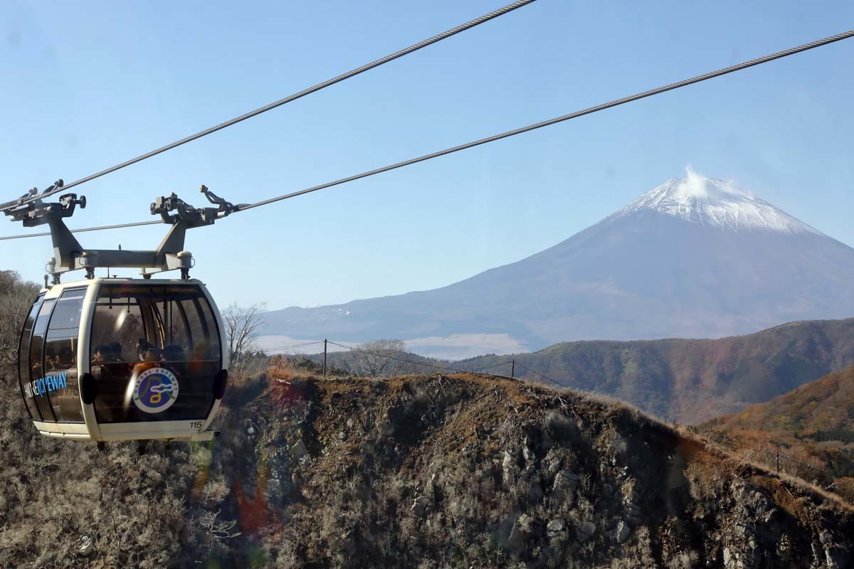 箱根ロープウェイに乗車すると富士山の眺望、そして箱根が活火山であることを示すように白煙を吹き上げる大涌谷を俯瞰することができる。